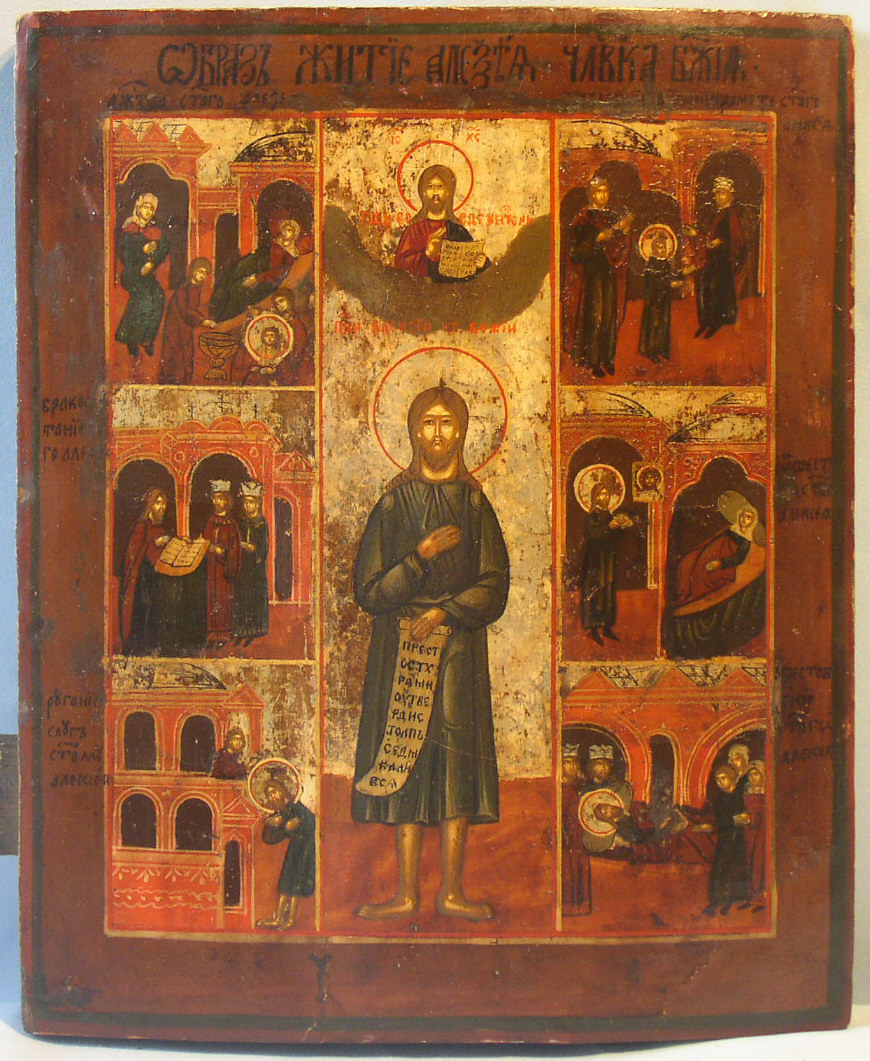 | Heiliger Alexeij der Gottesmann mit Szenen aus seinem Leben.Nordrussisch,Anfang 19.Jahrhundert.32x26cm.Vitenszenen: Links oben: Geburt des Heiligen Alexeij.Rechts oben: Einführung in die Kirche.Mitte links: Ehestiftung eines Fürstenpaares durch den heiligen Alexeij.Mitte rechts: Der heilige Alexeij spendet einer Sterbenden Trost.Unten links: Die Beschimpfung des Heiligen Alexeij durch einen Diener.Unten rechts: Tod des heiligen Alexeij.Seltene und gut erhaltene Vitenikone.Gering restauriert,hauptsächlich am Rand. |