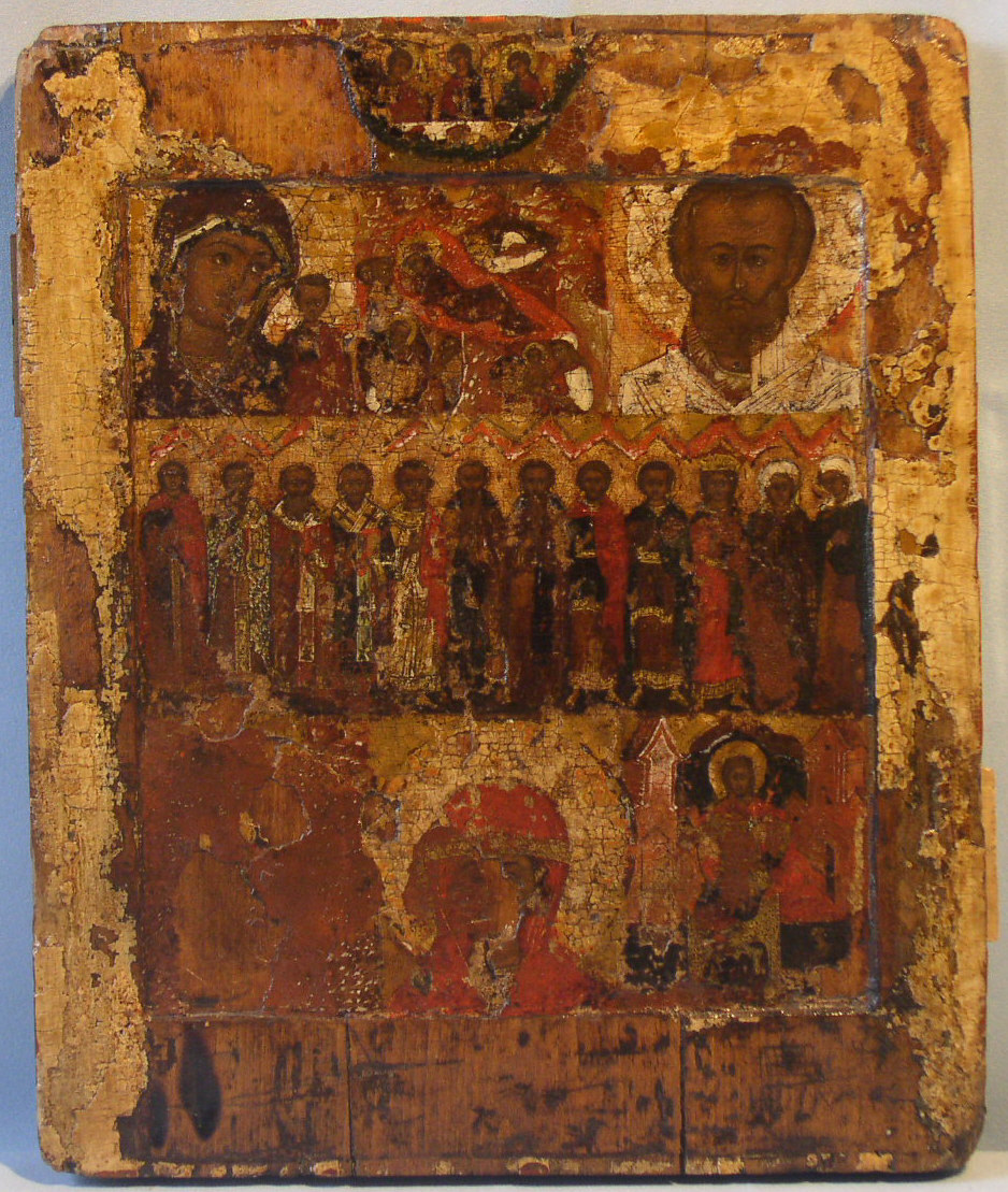 | 3 Reihen Ikone.Zentralrussisch (Moskau) um 1580. 32,5x27cm. Oberste Reihe von links: Gottesmutter von Kasan,Geburt Christi,Heiliger Nikolaus. Mittlere Reihe: 12 Heilige. Unterste Reihe: Hier ist nur noch der Heilige Nikita eindeutig identifizierbar. Fast vollständig originaler Zustand.Seltenes Sammlerstück! |