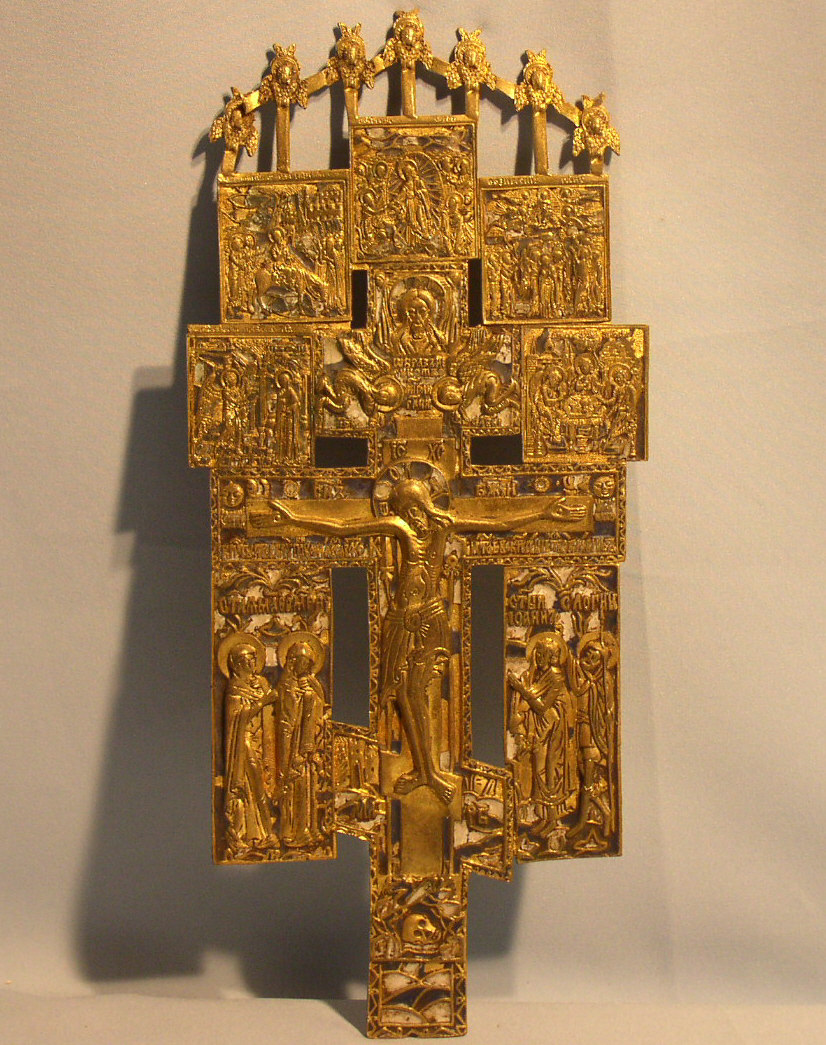 Erweiterte Kreuzigungsgruppe.18.Jahrhundert.Kreuzigungsgruppe mit 5 Festtagsdarstellungen und Engeln.33x15cm.Originale Emailierung.
