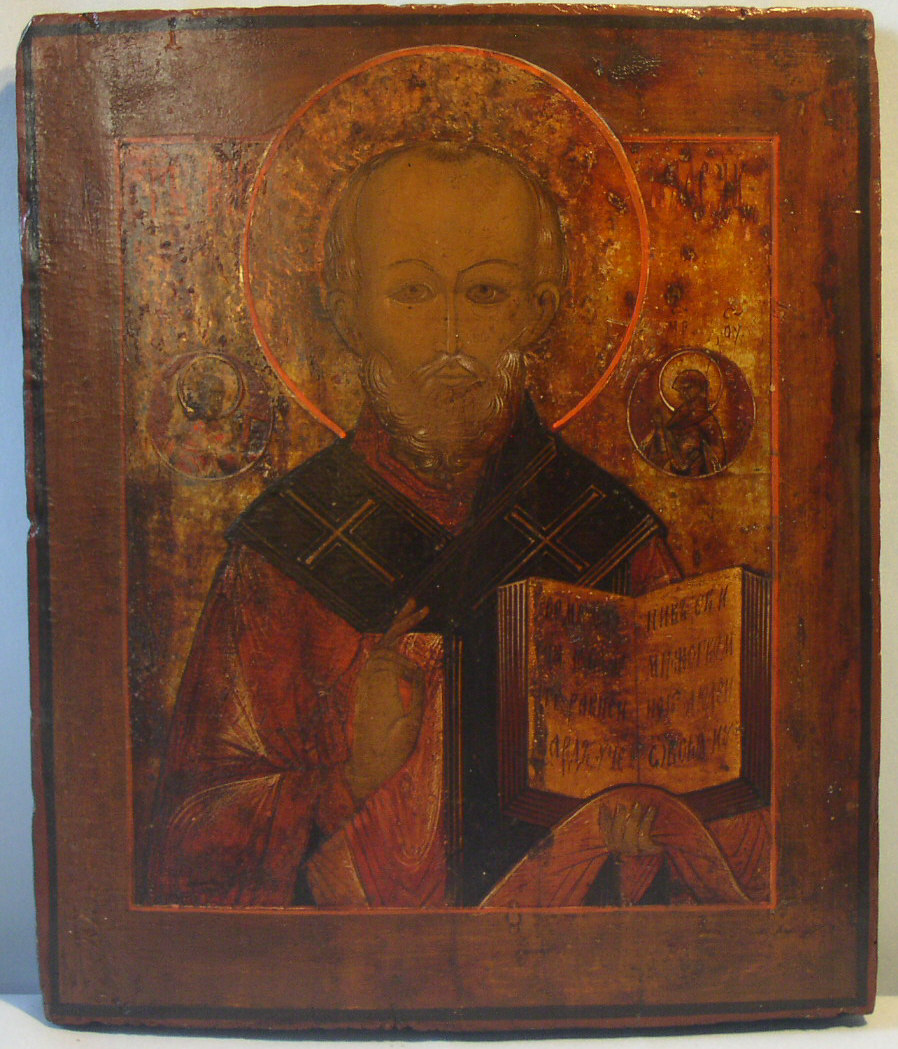 Heiliger Nikolaus,flankiert von Christus und der Gottesmutter.Zentralrussisch,um 1820.Kleinere Restaurierungen an Rand und Hintergrund.34x29cm.