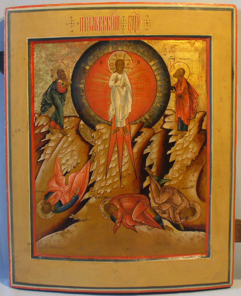 Verklärung Christi am Berg Tabor.Russisch,18.Jahrhundert (um 1750-80).Neben Christus Elias und Mose.Zu seinen Füßen: Petrus,Johannes und Jakobus.45x37cm.Prachtvolle,farbenfrohe Ikone.Minimal restauriert.Die Ikone war 1977 Im Hamburger Museum für Völkerkunde ausgestellt.Sammlerstück!