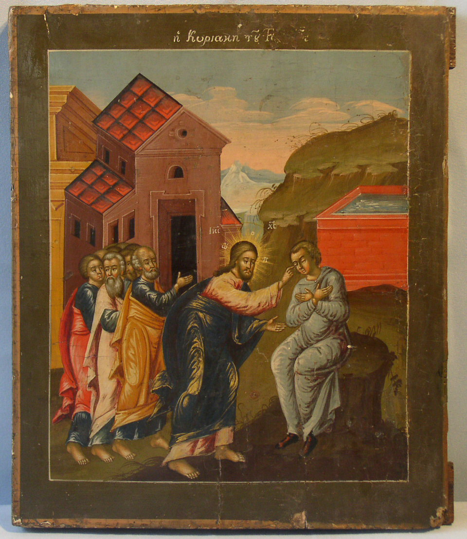 | Die Blindenheilung durch Christus.Westrussisch,um 1800.Gute Qualität dieses äusserst selten dargestellten Themas.Nur minimale,altersbedingte Schäden,hauptsächlich am Rand.31x26cm.Sammlerstück von allergrösster Seltenheit! Die Ikone ist auf einem russischen Ikonenbrett ausgeführt und zeigt einen stark griechisch beeinflussten Malstil.Sie ist griechisch beschriftet.Wahrscheinlich wurde sie von einem griechischen Maler in Russland ausgeführt. |