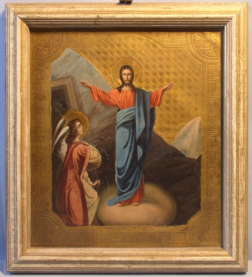 | Doppelseitige Ikone,Heiliger Nikolaus und Auferstehung Christi (Ostern).Russisch,Ende 19.Jahrhundert,um 1880.Auf vergoldetes Blech gemalt.Perfekter Zustand.Die Ikone fand als Wendeikone Verwendung und ist beidseitig aufhängbar.Der Rahmen eine spätere Zutat.43x38,5cm.Sehr selten! |