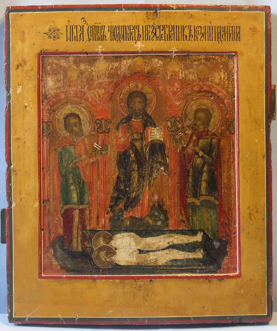 Die Arztheiligen Kosmas und Damian neben Christus.Russisch,um 1820. 32x27,5cm.