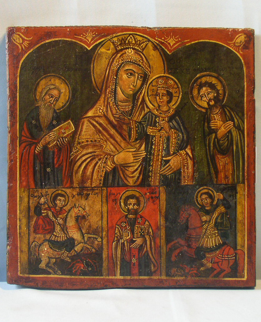 | 2 Reihen Ikone.Griechisch,um 1850.Oben die Gottesmutter Hodigitria (Variante) mit dem Heiligen Athanasios und Johannes dem Täufer.Unten von links: Heiliger Georg,Heiliger Nikolaus und Heiliger Dimetrius.Schöne,reichhaltige Ikone.Sehr gut erhalten.31x30cm. |