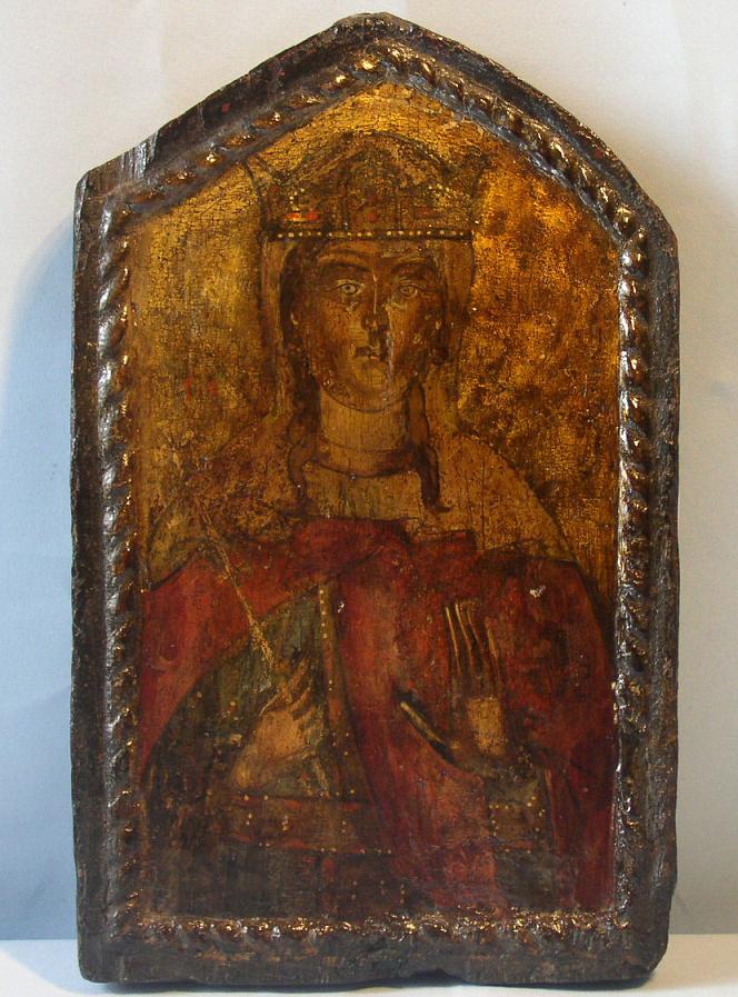 | Heilige Herrscherin (Irene?).Serbien-Nordgriechenland,um 1600.Gering restauriert.35,5x22cm.Leider ist die Namensinschrift nicht mehr vorhanden,so daß man nur vermuten kann,daß es sich um die Kaiserin Irene handelt.Durch den geschnitzten Rand,als frühe serbische Ikone erkennbar.Sammlerstück! |