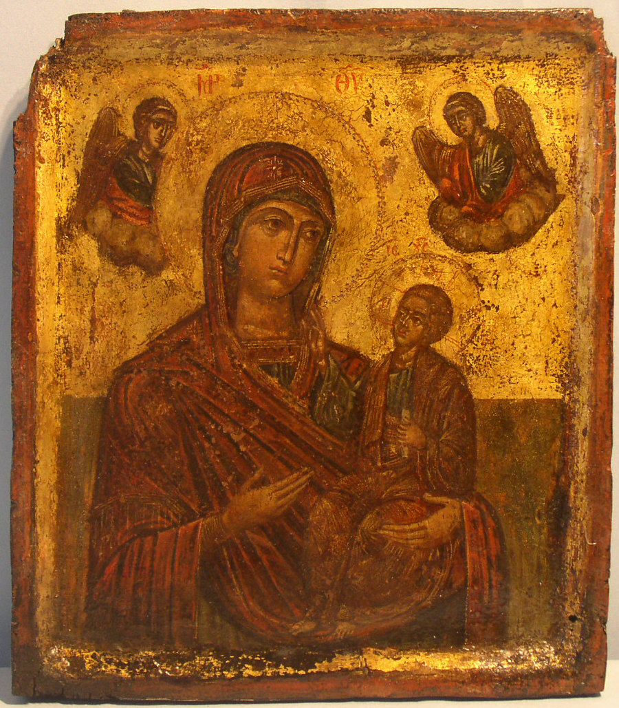 Muttergottes Hodigitria-Portatissa mit den Engeln.Zentralgriechisch,um 1580.Großartige,ganz im byzantinischen Stil gehaltene Ikone.35x31cm.Einige Restaurierungen.Seltenes Sammlerstück!