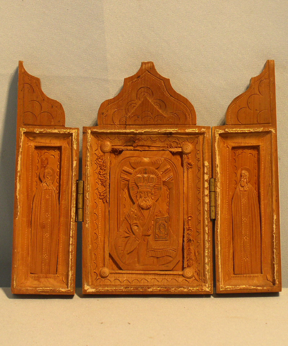 Geschnitztes Triptychon.In der Mitte der Heilige Nikolaus,auf den Flügeln 2 Heilige.Russisch-ukrainisch,19.Jahrhundert.15,3x17,5cm.Geschnitzte Triptycha sind selten.